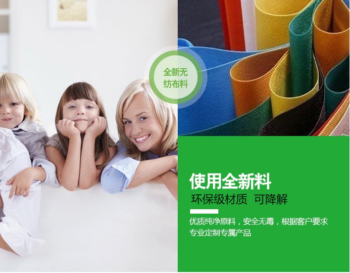 無紡布,又稱不織布,是新一代環保材料,具有拒水、透氣、柔韌、不助燃、無毒無刺激性、色彩豐富等特點。無紡布若置于室外經自然分解,其最長壽命只有90天,置于室內在5年內分解,燃燒時無毒、無味、且無任何遺留物質,從而不污染環境,宜于洗滌。它直接利用高聚物切片、短纖維或長絲通過各種纖網成形方法和固結技術形成的具有柔軟、透氣和平面結構的新型纖維制品。它具有塑料制品所不具有的環保性能,其被自然降解的時間遠遠低于塑料袋,因此,采用無紡布做成的無紡布袋也被公認為最經濟實惠的環保購物袋。